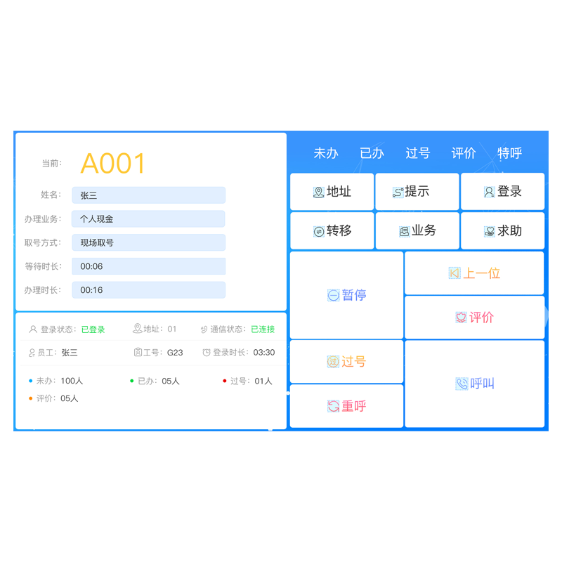 | 通信方式:局域网wifi 系统:windows Android 安装:基于系统即可 特点:全网软件呼叫,无延时已办/等待/当前/窗口信息—键呼叫号码即可响应 说明:主要用于窗口工作入员呼叫器排队号码使用 |